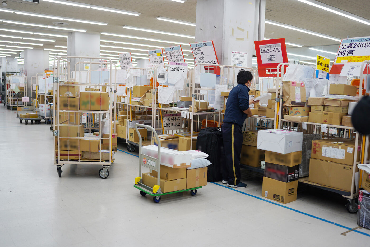 荷物はそれぞれのエリアごとに設けられた収集棚へ丁寧に積み分けられ、次の工程へとスムーズにつながるよう配慮されています。